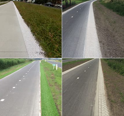 We also tested other solutions that were less outside-the-box. Among these were a 30 cm strip painted on the edge of a cycle path, which made the path optically narrower, and three different 50 cm strips constructed next to a cycle path, which added more surface for the cyclists to ride over [11,12], see picture below for the different solutions. These strips were made in a colour that either contrasted from a path’s main surface or not, and were also uncomfortable to ride over.