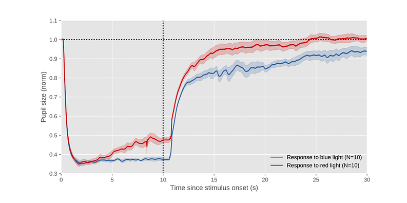 So, what’s going on here? The first period of the pupil light response, immediately after the light is turned on, is driven primarily by rods and cones, which (unlike ipRGCs) respond very quickly. For the light intensities that I chose here, the rod and cone response is about the same for red and blue light, and the initial pupil constriction for red and blue light is therefore the same as well (in both cases, the pupil constricts to ±35% of its original size in ±1.5 s). But then the rods and cones start to adapt: they become less responsive after a period of constant stimulation. If the pupil light response were driven only by rods and cones, the pupil therefore wouldn’t stay constricted. But why then can we walk around in the sun all day, while our pupils stay constricted the whole time? Well, this is where ipRGCs come in: they take over the task of keeping the pupil constricted after the rods and cones have adapted. And because ipRGCs are mostly sensitive to blue light, the pupil stays constricted more for blue than red light .