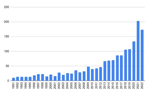 Note. The graph represents the number of published articles (vertical axis) per year (horizontal axis).