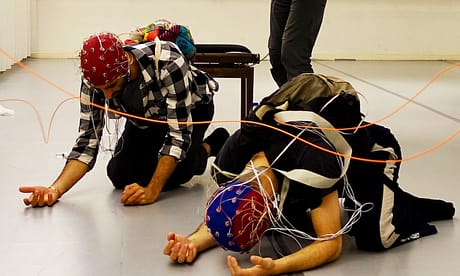 Notes on Synchrony is a living laboratory of brain and movement research. It is based on the (to me, poetical) finding that the brain waves of two (or more) people synchronize when they are engaged in a range of activities like dancing, singing, or playing instruments together, but also cooperating on certain tasks or agreeing within a debate. A group of neuroscientists from the UG and a group contemporary dancers set out to co-investigate the literal and metaphorical facets of this mental connection. In this exploration, science becomes oddly metaphorical, while art becomes loaded with scientific meaning. Imagine: dancers (wearing EEG caps) meet and part in a rhythmic drama of densely packed and deeply lived emotion, a poet writes and reads, a scientist observes and reports, a musician composes, a research assistant analyses incoming EEG (electroencephalogram) data, two visions (Kirsten Krans, who created the space for this dialogue to occur, and Marieke van Vugt, who studies inter-brain coherence in her lab) skillfully move the cables from the EEG caps between the dancers, showing a comparable degree of synchrony, connection, and commitment, while, finally, the public, having been offered cards and pens, takes notes on synchrony.