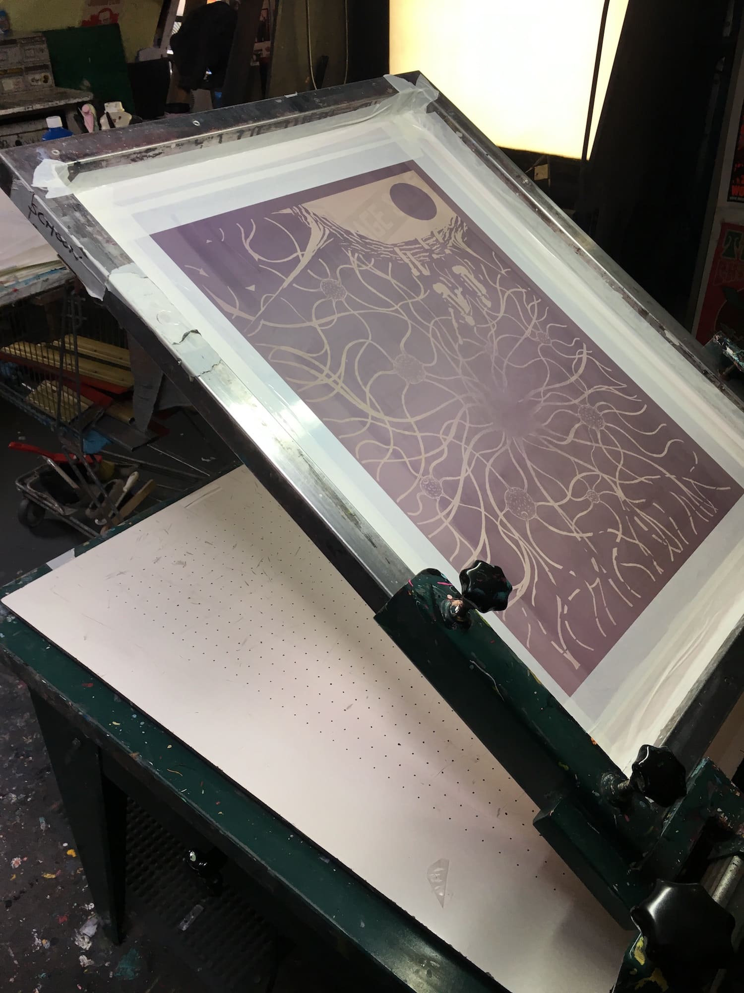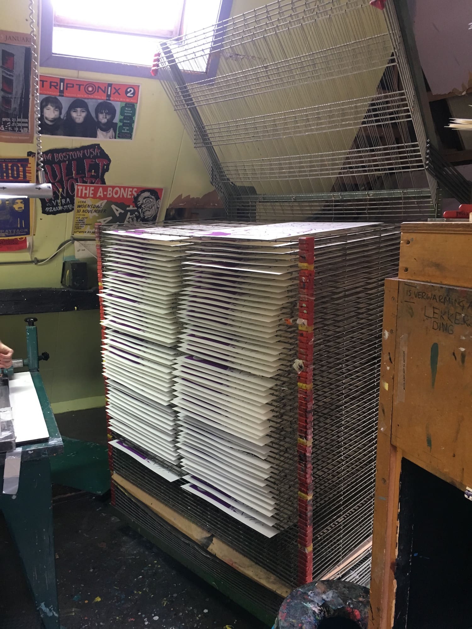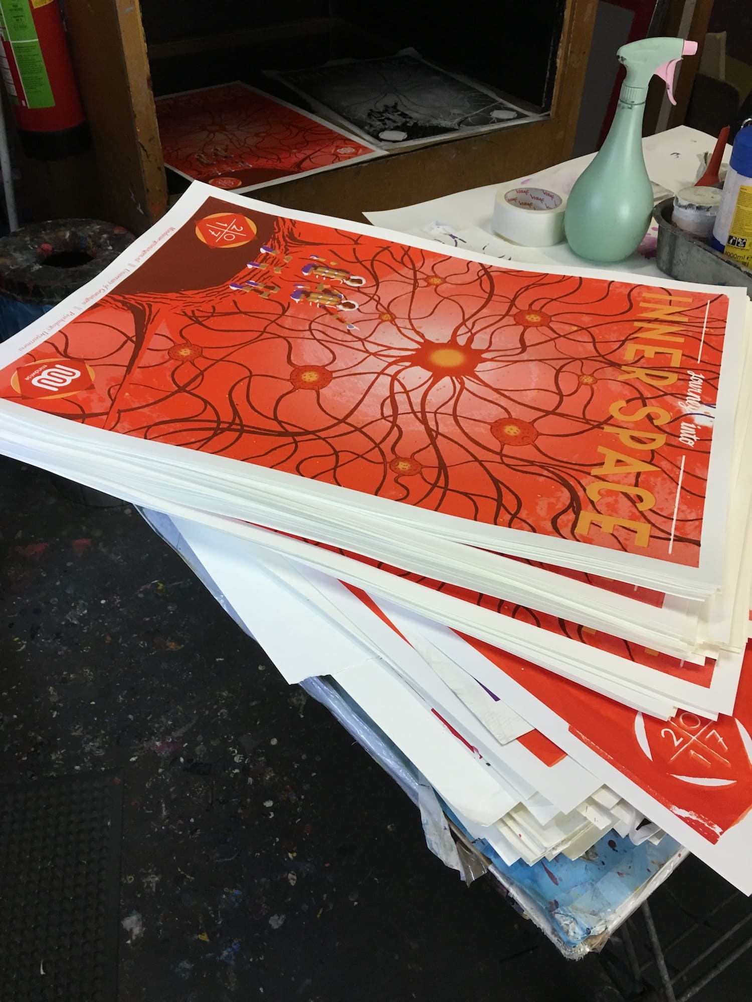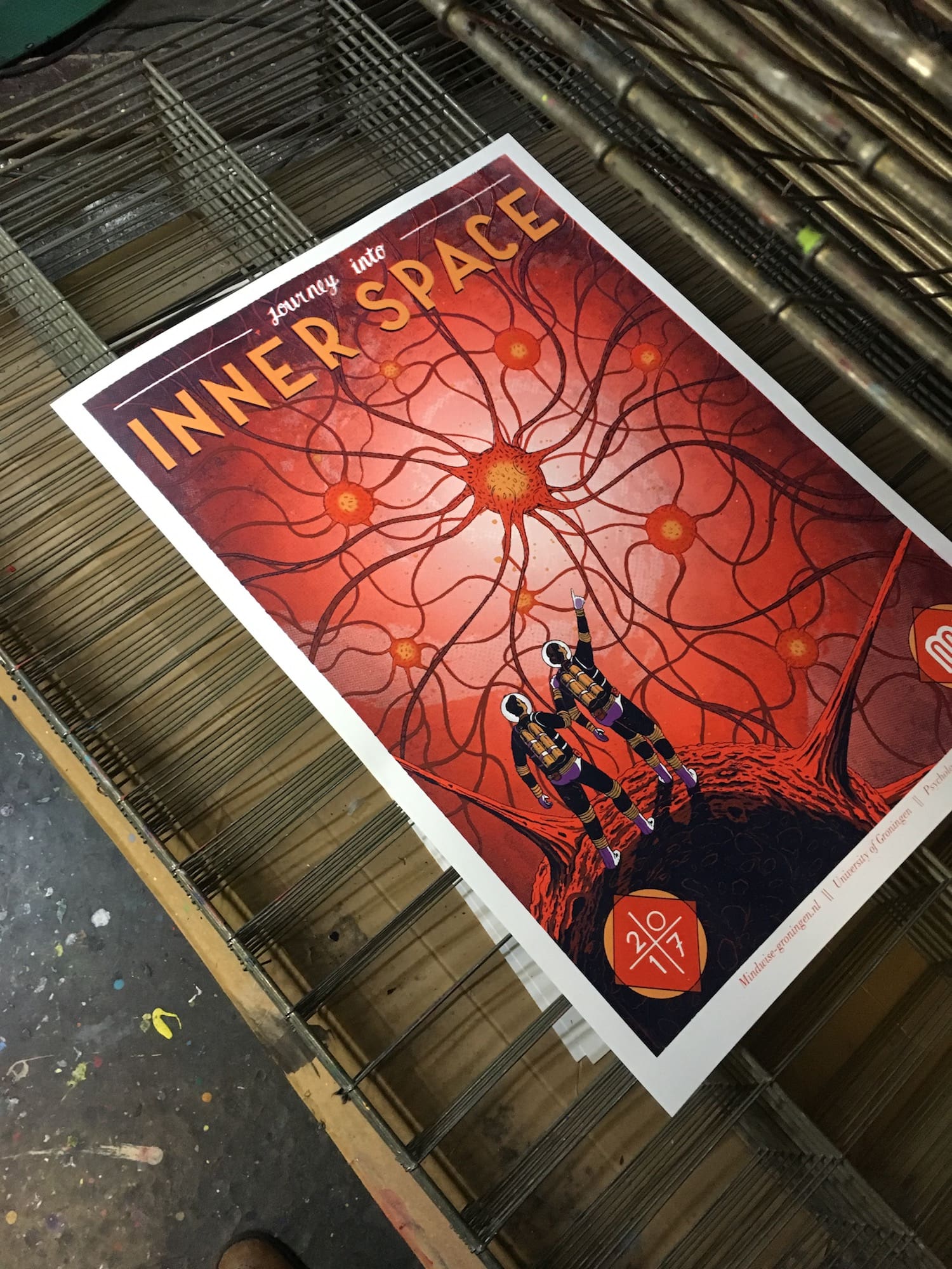 Screen printing (zeefdruk in Dutch) is a printing technique first developed about a thousand years ago and involves forcing ink onto paper (or other substrate) through a screen of fine mesh (think tiny tiny holes) using a squeegee. The screen itself, usually made of polyester, has the negative of each colour layer printed on it with a photo-sensitive resist. The resist is so called because it does not allow the ink to flow through, thus creating a pattern for each of the layers. Each layer is printed separately and allowed to dry before the next layer is printed over it, after carefully registering (aligning) the paper underneath the screen. The video below shows the printing of the first layer. At the bottom of this page, you can see a short series of photos from the process of hand-printing the 2017 Mindwise poster in the attic of Vera, just a few days ago.