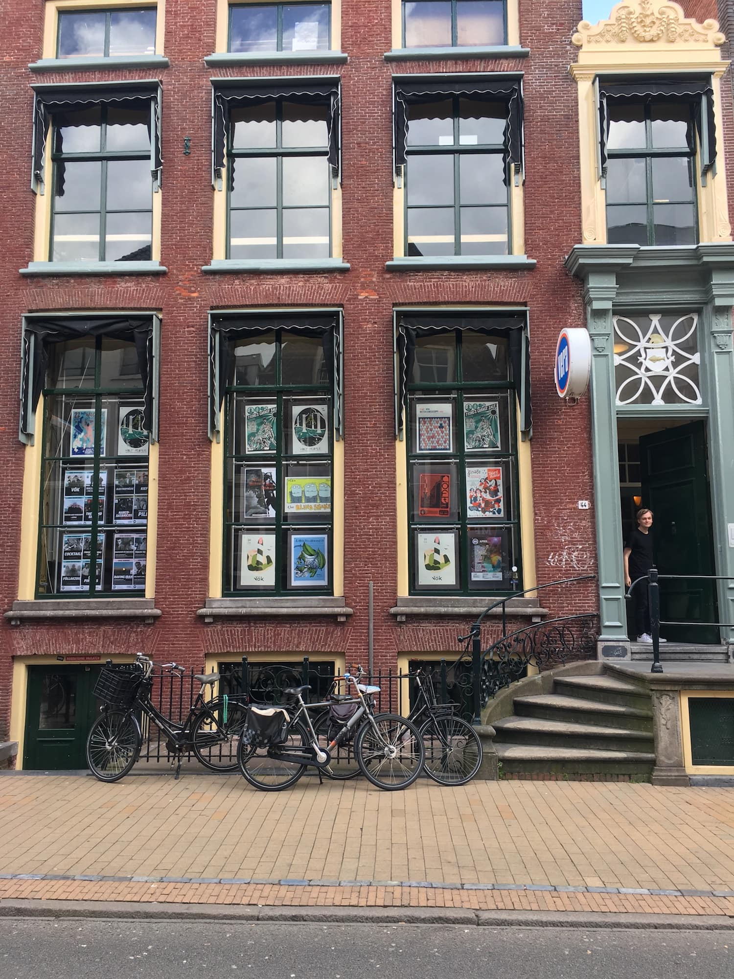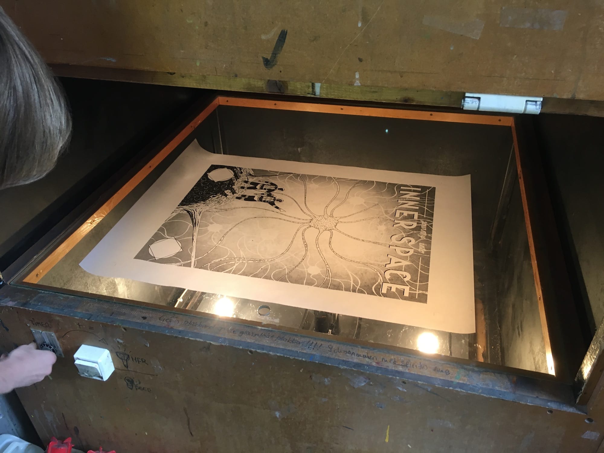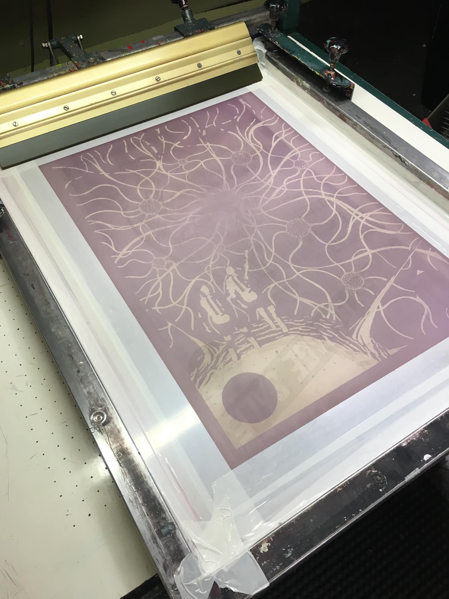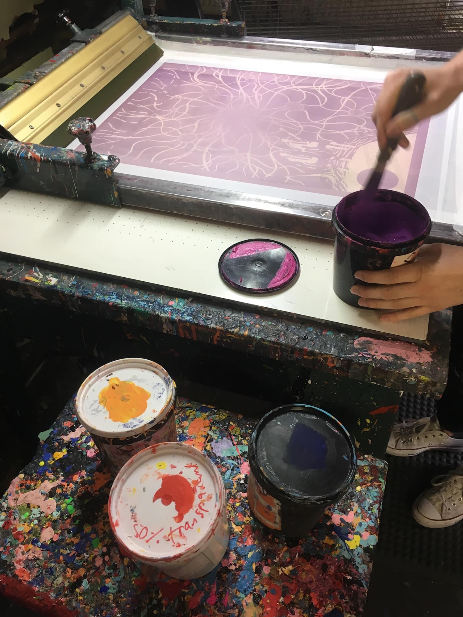 Screen printing (zeefdruk in Dutch) is a printing technique first developed about a thousand years ago and involves forcing ink onto paper (or other substrate) through a screen of fine mesh (think tiny tiny holes) using a squeegee. The screen itself, usually made of polyester, has the negative of each colour layer printed on it with a photo-sensitive resist. The resist is so called because it does not allow the ink to flow through, thus creating a pattern for each of the layers. Each layer is printed separately and allowed to dry before the next layer is printed over it, after carefully registering (aligning) the paper underneath the screen. The video below shows the printing of the first layer. At the bottom of this page, you can see a short series of photos from the process of hand-printing the 2017 Mindwise poster in the attic of Vera, just a few days ago.