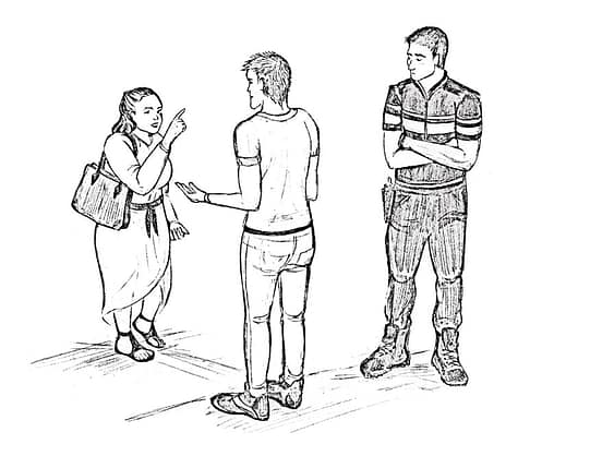 Figure 2. The expression of anger-related behaviors (e.g., the woman on the left is talking by using the pointing gesture against a man who was not involved in the previous conflict event – behavioral code: Talking with aggressive gestures). Drawing by Lucia Berti.