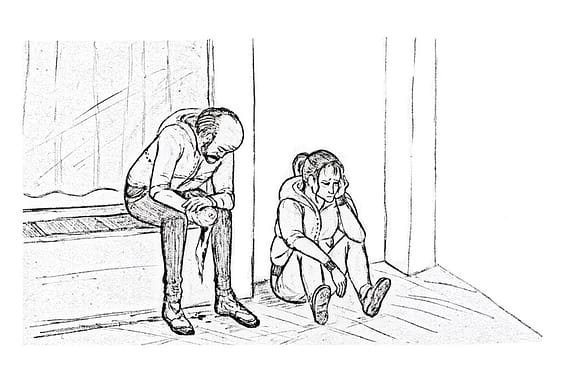 Figure 1. The expression of anxiety-related behaviors (e.g., the girl on the right touches her face – behavioral code: Self-touching) and physical sufferance (e.g., the man on the left attends his injured hand – behavioral code: Self-care). Drawing by Lucia Berti.